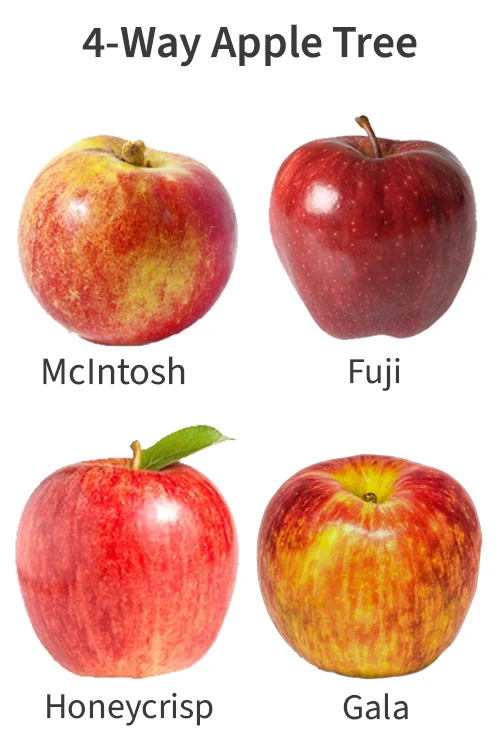 With the 4-in-1 Apple Tree, you can save space and enjoy a range of flavors, all from one self-pollinating tree. As the name suggests, this tree contains four varieties: McIntosh, Gala, Fuji, and Honeycrisp. These are among the best and most famous for their hardiness, disease resistance, and delicious fruits. The fruits mature and are ready for harvest in late summer to early fall, depending on location.