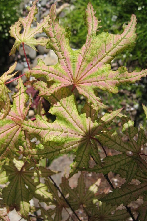 A showpiece of a tree with ‘Aka Shigitatsu Sawa’ is a rare and beautiful mid-size upright Japanese Maple adored for its wonderful changing colors throughout the seasons. The colors can differ based on climate and the amount of sunlight the tree receives. With four or fewer hours of sunlight daily, its deeply-lobed reticulated leaves usually emerge pink, salmon, or peach shades with red highlights and green veins, transitioning to green and cream-white shades during summer and vibrant orange-red in fall. With five or more hours of sunlight daily, the leaves usually emerge deeper pink-red to red shades with green veins, transitioning to green with red highlights and vibrant orange-red shades in fall. The colors are fantastic, no matter the location. Though it will tolerate full sun in cool or mild summer climates, in the hot and humid South, we’ve noticed that the foliage tends to hold up better through the seasons with some filtered sun or shade during the midafternoon hours when the sunlight is most intense, especially on container-grown specimens. Sure to be a captivating specimen in the garden.