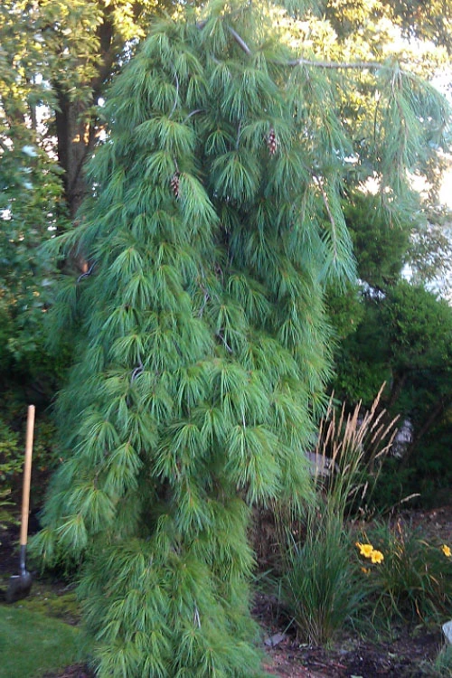 Though drought tolerant when established, the Angel Falls Weeping Eastern White Pine grows best in a moist but well-drained soil of average fertility and full sun, but will tolerate some light afternoon shade. As with so many other ornamental shrubs and trees, a constantly soggy soil can cause problems with the roots. Does not require pruning however can be trimmed annually in late winter to maintain a smaller plant or for very interesting topiary forms or bonsai.