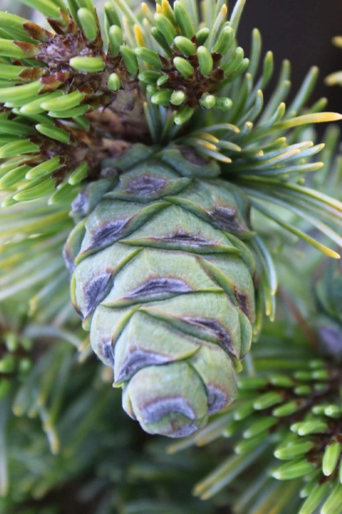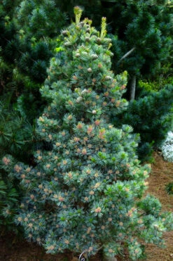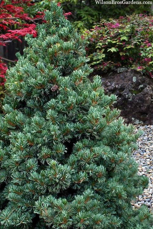 A captivating addition to the landscape, the Azuma Japanese White Pine is a small, coniferous evergreen tree adored for its beautiful texture and soothing color. Adding about 6 inches yearly to its height, it slowly forms an irregular pyramid 8 to 10 feet tall and 5 to 7 feet wide when all grown up, making it an excellent choice for smaller garden spaces and containers. It is densely clothed in tight bunches of distinctive, short (1.5″ long), blue-green needles year round. Attractive purple-raspberry-colored cones are an excellent contrast with the foliage of the tree. An elegant and low-maintenance beauty, Azuma is a fantastic, long-lived addition to Asian or Zen-theme, rock, and conifer gardens and is highly suitable for Bonsai. It thrives in coastal environments due to its salt tolerance, and while it is listed as cold hardy to USDA Zone 5a, we hear it’s handling winter low temperatures in Zone 4 with no problem.Â
