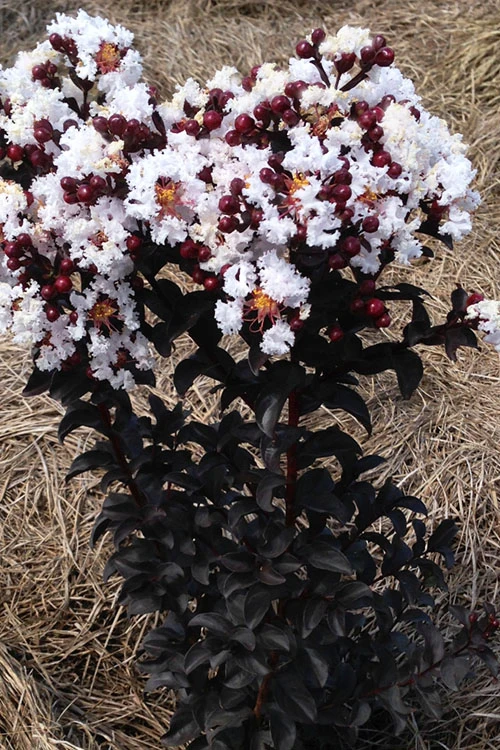 Ebony Glow is an exciting new Crape Myrtle hybrid that has the darkest black leaves we’ve seen on any Crape Myrtle, or any other shrub or tree for that matter! During summer and into fall, Ebony Glow is smothered with white to soft pink flowers that are a stunning contrast to the intense black leaves. The leaves maintain black color throughout the season. A fast growing, mid-size Crape Myrtle to 10-12 feet in height with a spread of about 6-8 feet at maturity – the perfect size flowering tree for today’s smaller gardens!