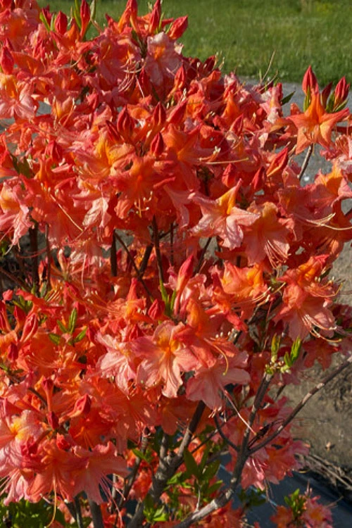 With gorgeous flowers that light up and fill the garden with a wonderful spicy aroma, the Pat Ryan Aromi Azalea is a deciduous Aromi hybrid that produces abundant clusters of fire-red buds that open to exquisite, large, spicy-sweet scented flowers with ruffled, multi-color petals in shades of peach, pink, orange and golden yellow. Heat and humidity tolerance, vigor, fragrance, and unique color all come together for an absolutely stunning color display and delicious aroma in the spring garden. One of our all-time favorites!