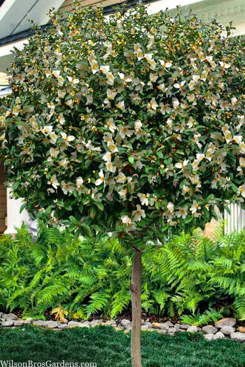This is the single-trunk tree form version of ‘Serendipity’, a new and improved Banana Shrub, also known as Port Wine Magnolia, with larger flowers and a much heavier bloom than the original species. You’ll definitely see the flowers on this one! We also hear that ‘Serendipity’ might be even more cold hardy. For 3 to 4 weeks in spring the abundant, fragrant, creamy white flowers come all at once aging to butter-yellow and smelling like a banana popsicle, hence the common name. The oblong, glossy, evergreen green leaves are attractive year round and serve as the perfect backdrop to the numerous flowers. Growing upwards of 15 feet in height and equally as wide, Serendipity makes an outstanding focal point specimen in sunny to partially shaded landscape borders. Excellent around patios, decks, porches and other outdoor living spaces where the fragrant flowers can be enjoyed from close up. Though originally from China, this magnificent plant is one of the classic evergreens of the Old South.