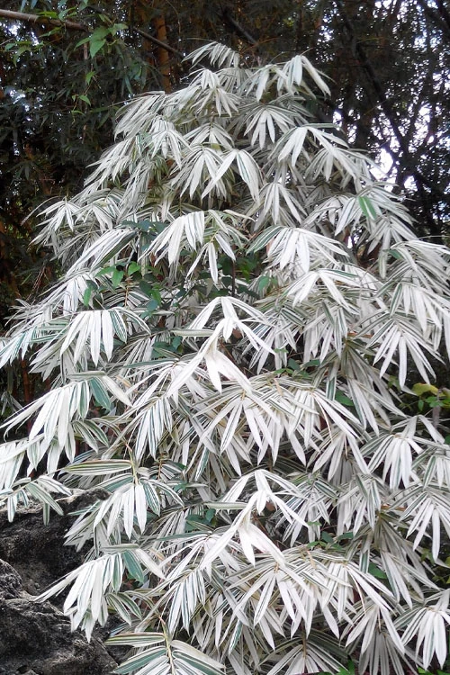 The Shiroshima Bamboo is easy to grow in a moist but well-drained soil of average fertility and sun or shade. That said, we think this species looks best in part shade to shade. Foliage will be more white with more shade and may turn more yellow with full sun. It spreads very slowly, more like a clumping bamboo. Grows well in the ground or in pots.
