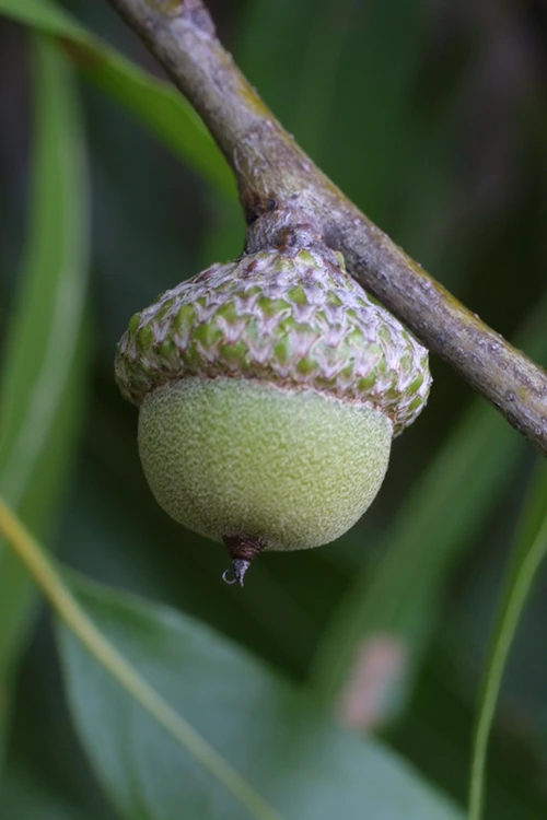 Fruit:Â Â Yes, nuts that are inedible to humans but other mammals eat them. 1/2-inch oval acorns with a thin, saucer-like capÂ