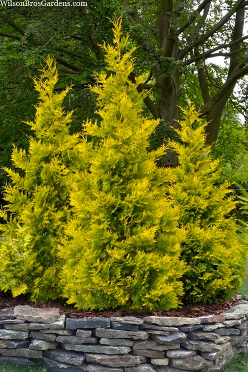 Growing naturally in a narrow, pyramidal shape 10 to 15 feet tall and 4 to 5 feet wide at its base, the Yellow Ribbon Arborvitae is ideal for use as a specimen, in groupings or as a privacy hedge in sunny landscape borders. Also excellent as an accent or to frame the corners of homes and other building or use to to frame an entrance. Can also be grown as a colorful centerpiece in container gardens. A fine addition to conifer gardens, rock gardens, yellow theme color gardens and formal gardens.